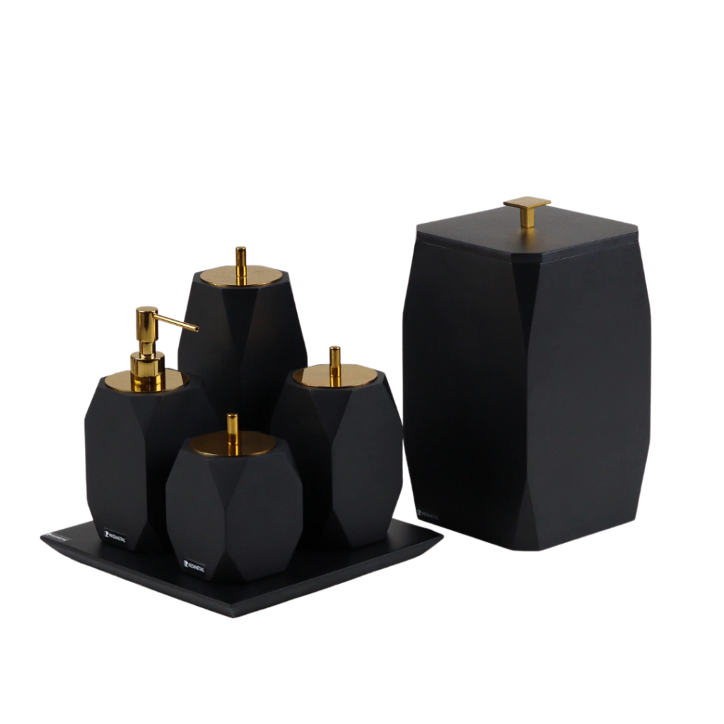 Transforme seu banheiro em um espaço sofisticado e organizado com o nosso conjunto suíte, composto por saboneteira, porta escova, porta cotonete e porta algodão, ideal para quem busca aliar funcionalidade com design. A bandeja e a lixeira junto ao kit mantém o seu ambiente mais organizado, proporcionando praticidade e estilo.