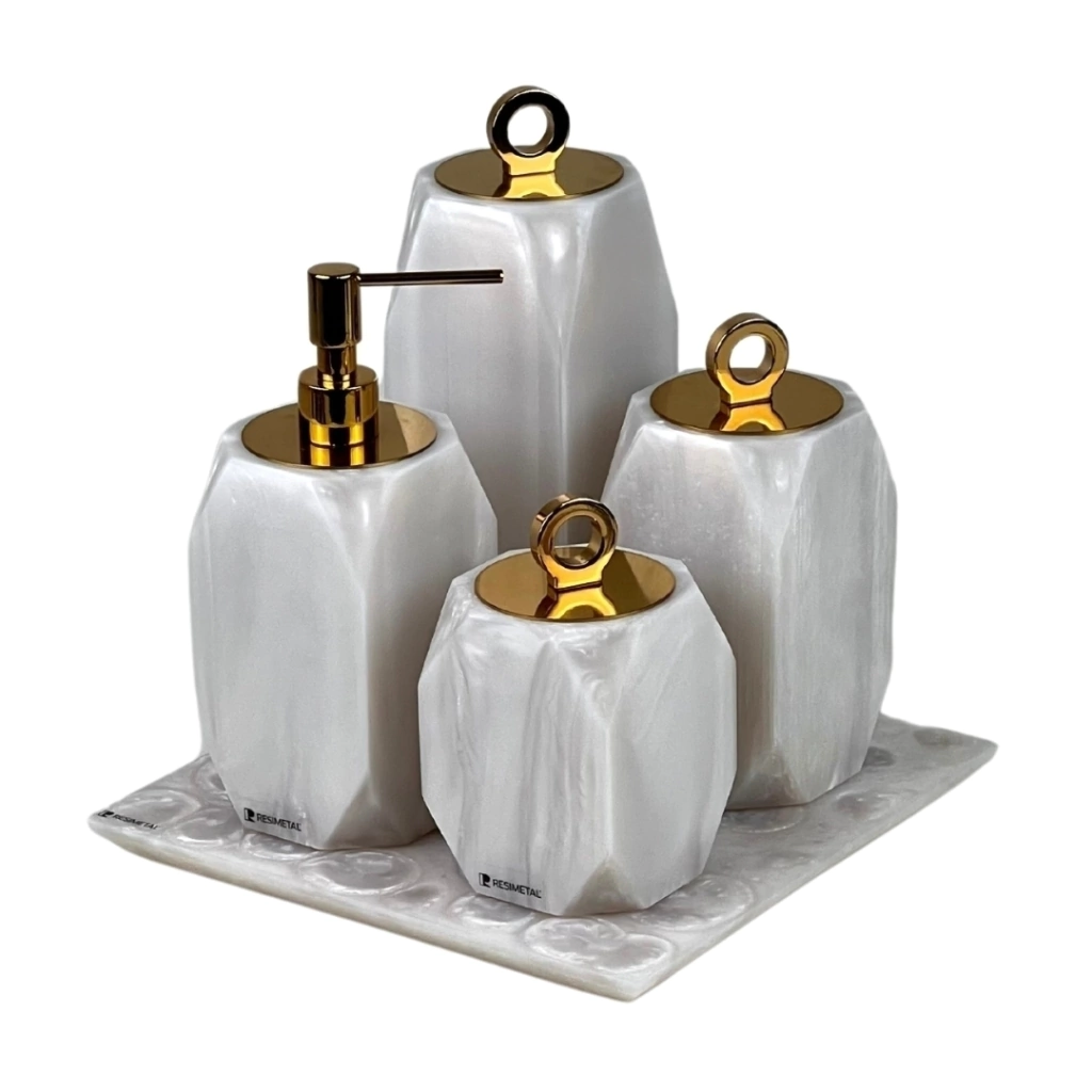 Nosso conjunto suíte traz a praticidade que você precisa em seu banheiro, sem abrir mão do estilo e da sofisticação. Com quatro peças essenciais, uma saboneteira, um porta escova, um porta cotonete e um porta algodão, você terá todos os itens organizados e sempre à mão. Adicione um toque de classe ao seu banheiro com nosso conjunto suíte.