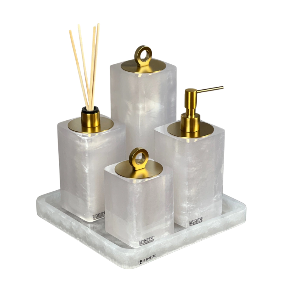 Transforme seu banheiro em um ambiente sofisticado e bem organizado. Este é o conjunto perfeito para quem valoriza um design funcional e moderno. Nosso conjunto suíte inclui uma saboneteira, um porta escova de dente, um porta cotonete e um difusor de aromas, todos dispostos em uma bandeja que combina praticidade e elegância.
