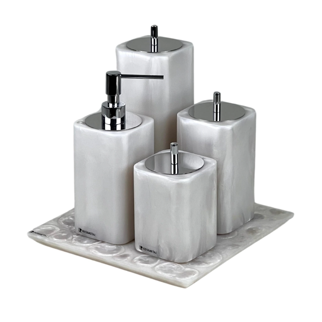 Nosso conjunto suíte traz a praticidade que você precisa em seu banheiro, sem abrir mão do estilo e da sofisticação. Com quatro peças essenciais, uma saboneteira, um porta escova, um porta cotonete e um porta algodão, você terá todos os itens organizados e sempre à mão. Adicione um toque de classe ao seu banheiro com nosso conjunto suíte.