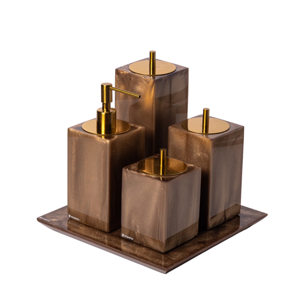 Transforme seu banheiro em um espaço sofisticado e organizado com o nosso conjunto suíte, composto por saboneteira, porta escova, porta cotonete e porta algodão, ideal para quem busca aliar funcionalidade com design. A bandeja e a lixeira junto ao kit mantém o seu ambiente mais organizado, proporcionando praticidade e estilo.