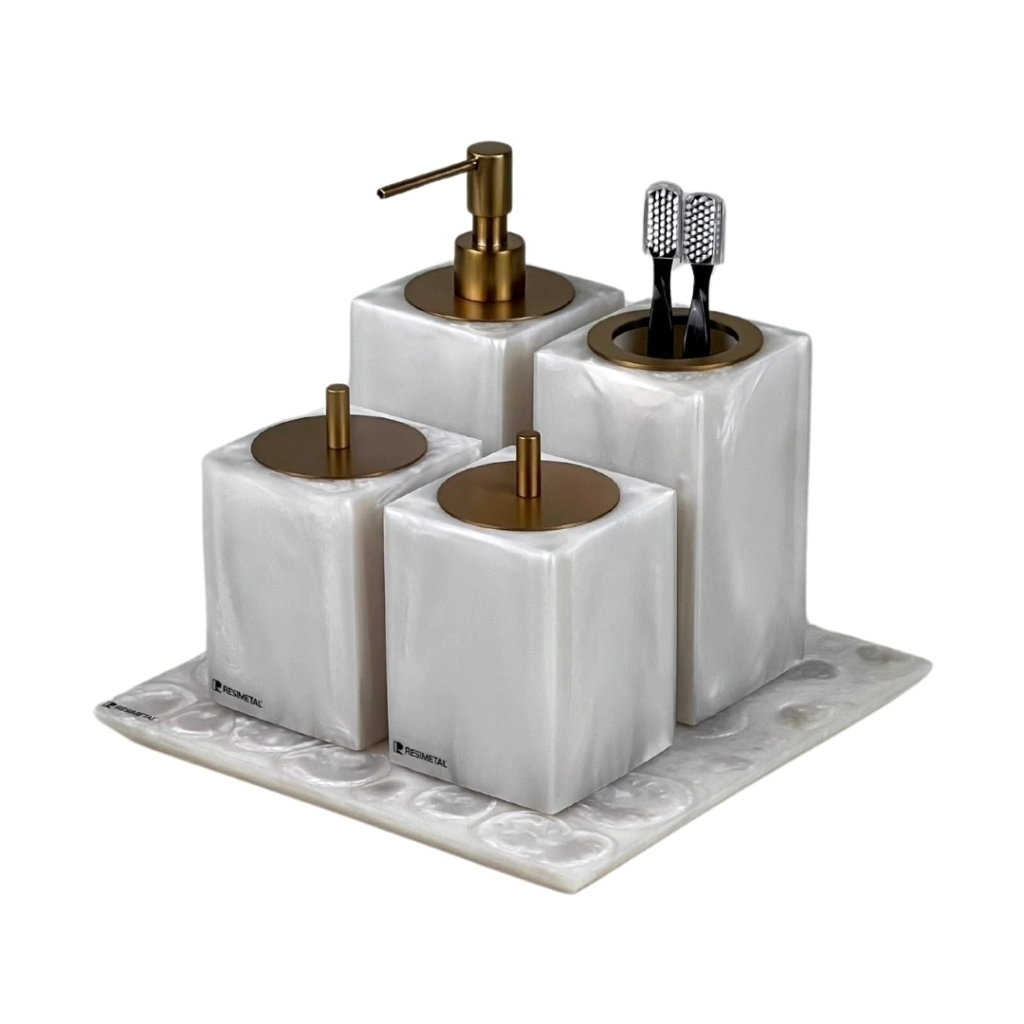 Nosso conjunto suíte traz a praticidade que você precisa em seu banheiro, sem abrir mão do estilo e da sofisticação. Com quatro peças essenciais, uma saboneteira, um porta escova, um porta cotonete e um difusor de aromas, você terá todos os itens organizados e sempre à mão. Adicione um toque de classe ao seu banheiro com nosso conjunto suíte.
