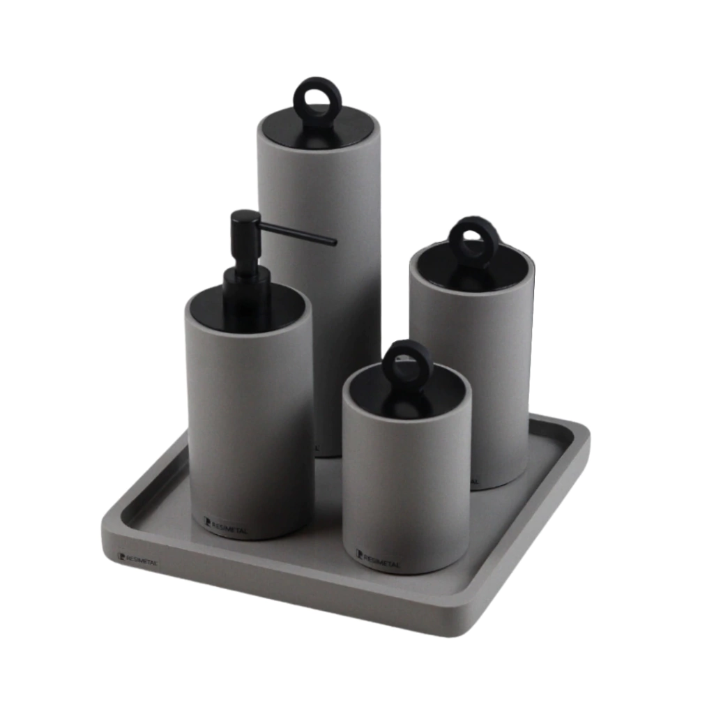 Transforme seu banheiro em um ambiente sofisticado e bem organizado. Este é o conjunto perfeito para quem valoriza um design funcional e moderno. Nosso conjunto suíte inclui uma saboneteira, um porta escova de dente, um porta cotonete e um porta algodão, todos dispostos em uma bandeja que combina praticidade e elegância.