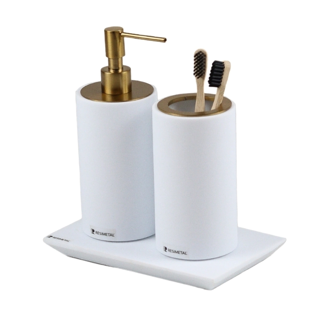 Conjunto para suíte, a combinação perfeita de elegância e funcionalidade para o seu banheiro. Composto por um dispenser para sabonete líquido e um porta escovas, ambos com acabamento sofisticado. A bandeja junto ao kit mantém tudo organizado, proporcionando praticidade e estilo.
