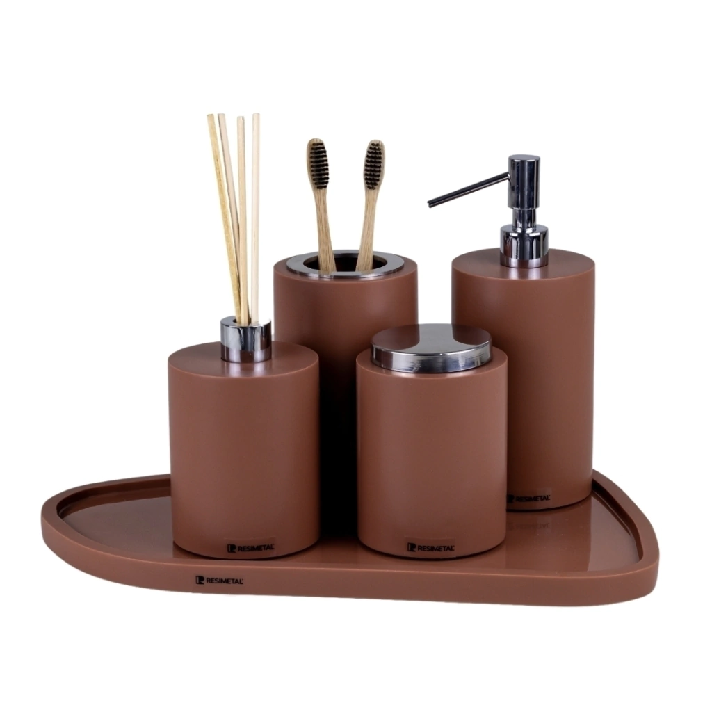 Transforme seu banheiro em um ambiente sofisticado e bem organizado. Este é o conjunto perfeito para quem valoriza um design funcional e moderno. Nosso conjunto suíte inclui uma saboneteira, um porta escova de dente, um porta cotonete e um difusor de aromas, todos dispostos em uma bandeja que combina praticidade e elegância.